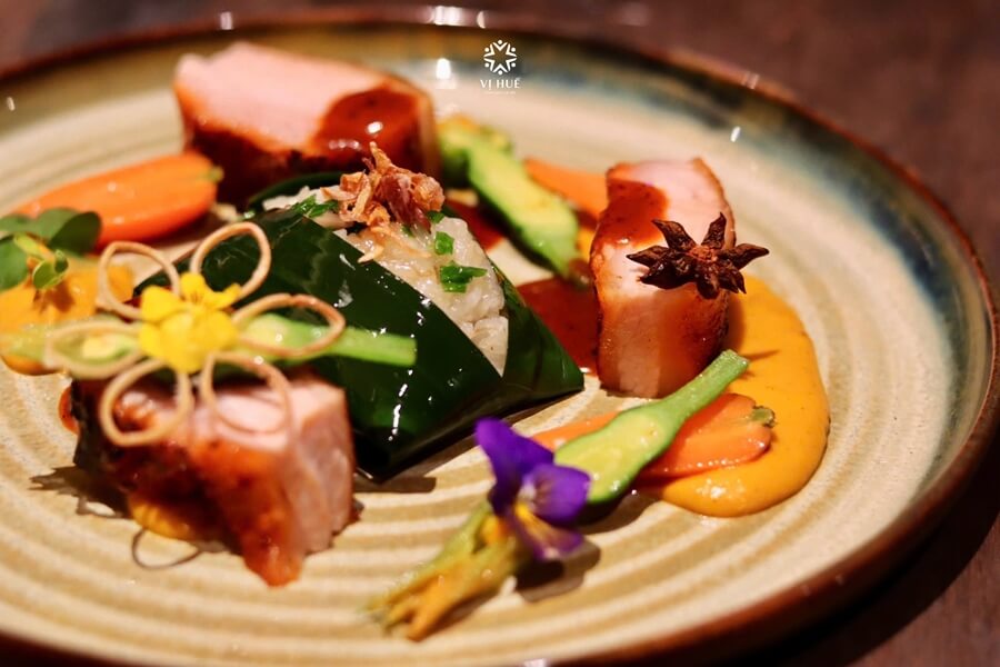 Beside the pork is a small portion of sticky rice wrapped in green leaves. The grains are sticky and fragrant, adding balance when enjoyed together with the meat. At the base of the plate is a layer of orange-yellow pumpkin or sweet potato sauce, offering a mild sweetness and serving as a backdrop for the diagonally cut vegetables. A single star anise placed on top perfumes the dish the moment it is served. This plate blends ingredients from A Luoi with a modern presentation, delivering clear layers of flavor—rich, tender, and full-bodied without overwhelming the palate.