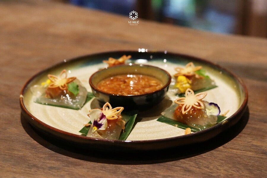The restaurant presents Hue local dishes in a more modern way while still preserving the inherent elegance of this region. Each dish is meticulously arranged, using natural flowers, leaves, and harmonious colors that reflect the kitchen’s thoughtful care in every step of preparation. Below are the dishes that left the strongest impression during my meal.