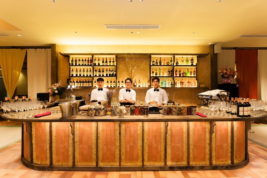 Stepping inside, the first thing that caught my eye was the central bar. The counter, finished in wood or reddish-brown brick, reflected the warm yellow light onto rows of wine bottles, giving the area the feel of a small, cozy display space. The terracotta tile floor, in deep earthy tones, adds a rustic touch typical of Hue’s traditional houses, creating an interesting contrast with the elegant dining furniture.