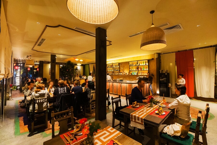 The interior is lit with warm yellow lighting that immediately feels soothing. Bamboo and rattan chandeliers hang high above, casting a soft glow, bright enough to see the food clearly, yet gentle enough to maintain a sense of privacy at each table. Wooden pillars and light yellow, white, and terracotta-orange curtains are placed between seating areas, subtly dividing the space while keeping it airy and easy to move around.